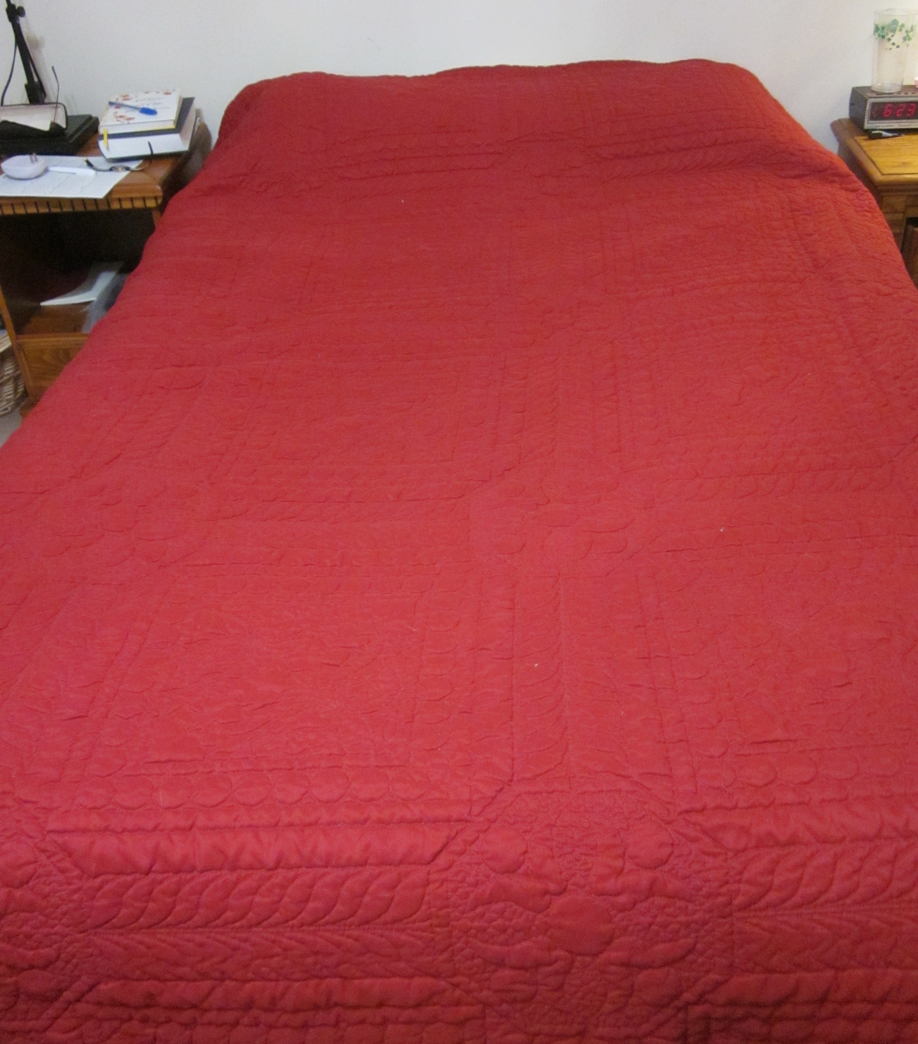Dark red. 82” x 100”. No damage, I just wanted a change. Have another close-up picture of the sewn in pattern. Please email if interested.