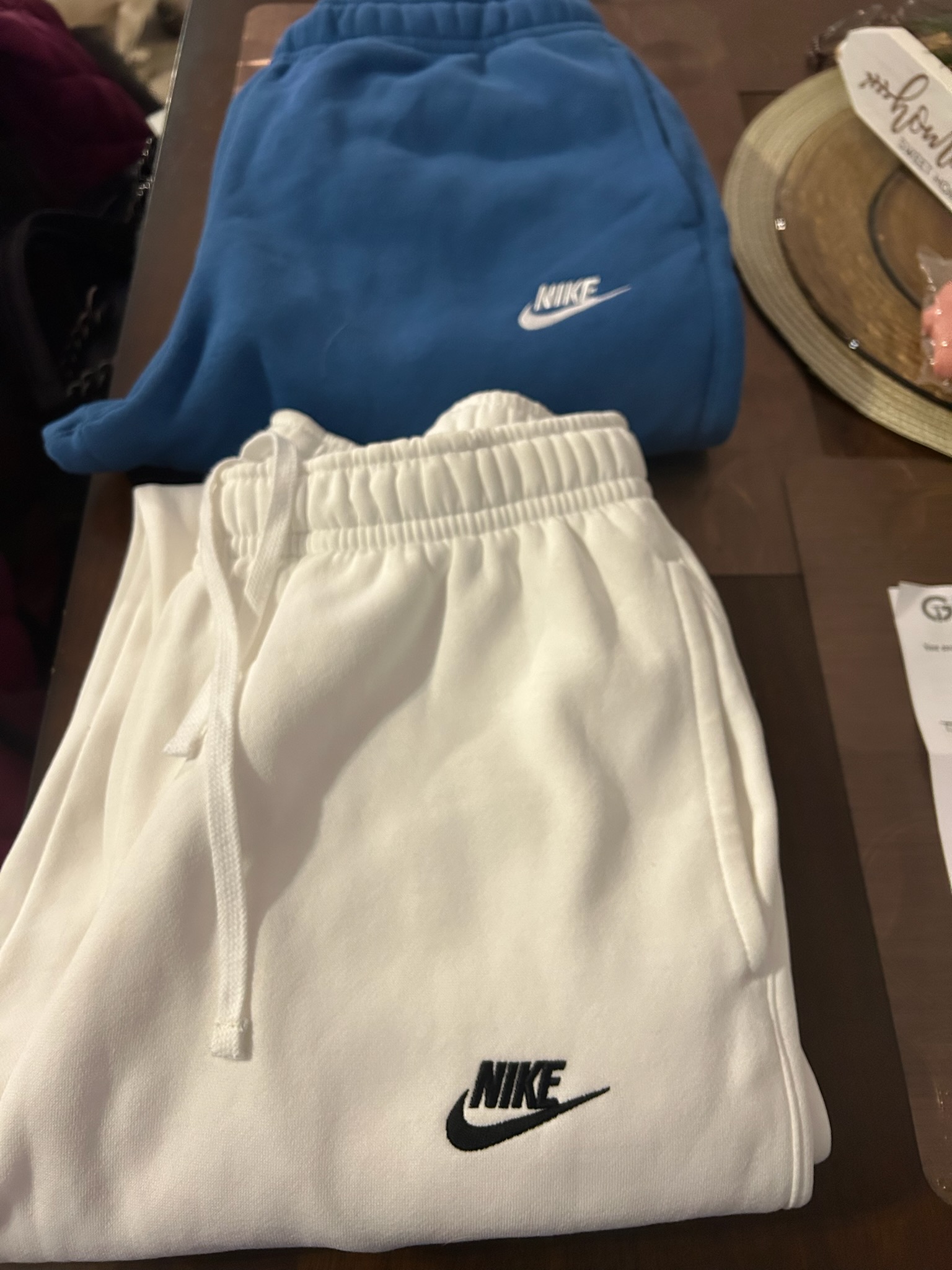 2 pair of brand-new Nike sweatpants. Blue pair size men's small, tall. White pair men's medium tall.